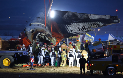소방당국은 소방대응 3단계를 발령하고 구조 작업을 이어가고 있다. 사고 현장에서는 기체 후미부터 구조 작업이 진행되고 있으며, 공항 담벼락 안팎으로 여객기 잔해와 탑승객의 소지품이 흩어져 있다. 검게 그을린 여객기 꼬리 부분이 외벽 밖으로 드러나 있으며, 절단기 작업을 통해 동체 해체 작업도 진행 중이다.