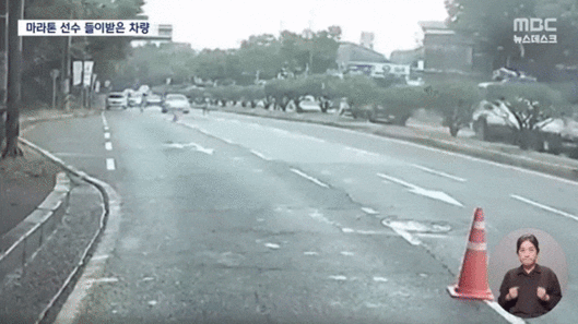 김해중부경찰서에 따르면 15일 오전 11시 34분께 김해 구산동 노인복지회관 인근 3차로에서 A 씨가 몰던 차량이 통제구간(1, 2차선)을 달리던 남자일반부 경기도체육회 소속 20대 선수 B 씨를 뒤에서 들이받았다.