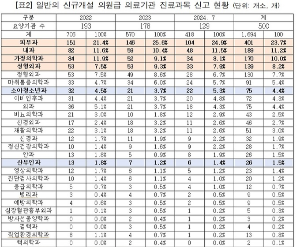 최근 3년간 신고된 진료과목 현황을 살펴보면 피부과가 401개(23.7%)로 가장 많았다. 2022년 151개, 2023년 146개, 2024년 104개로 매년 가장 많았다. 이어 만성질환, 비만치료 등으로 인기있는 내과(189개, 11.2%)와 가정의학과(170개, 10.0%)가 뒤를 이었으며, 성형외과(139개, 8.2%)와 최근 척추질환 등으로 인기있는 정형외과(130개, 7.7%), 마취통증의학과(91개, 5.4%) 순이었다.