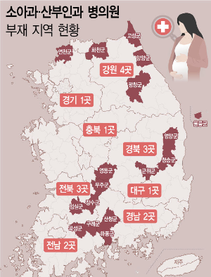 이 중 경기 연천군, 강원 고성군, 양양군, 평창군, 화천군, 충북 영동군, 전북 무주군, 임실군, 장수군, 전남 곡성군, 구례군, 대구 군위군, 경북 영양군, 울릉군, 청송군, 경남 산청군, 하동군 등 17개 시군구에는 산부인과와 소아과를 진료과목으로 신고한 병원, 표시과목을 산부인과와 소아과로 한 의원이 1곳도 없다.